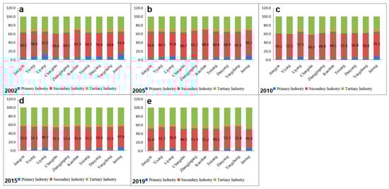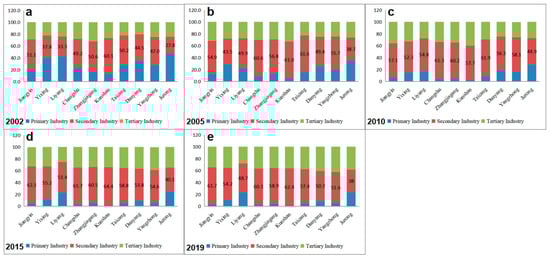 The changes in the economic structure in the county-level cities in southern Jiangsu from 2002 to 2019 ((a)—2002; (b)—2005; (c)—2010; (d)—2015; (e)—2019), presented as shares of the secondary sector. Source: Jiangsu Statistical Yearbook 2003–2020.