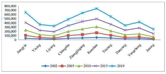 To clearly illustrate China’s industrialization conditions, this paper analyses 10 county-level cities using data from 2002, 2005, 2010, 2015, and 2019. The data from 2002 reflect the initial development conditions of the county-level cities in the early 21st century. In this case, 2005, 2010, and 2015 were, respectively, the last years of the Tenth Five-Year Plan, the Eleventh Five-Year Plan and the Twelfth Five-Year Plan, and so are vital statistical points describing China’s fast economic growth process at the start of the 21st century, and 2019 was the final year of the study period.