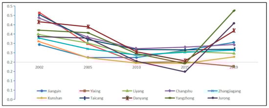 We use the rate of value added by industry as a representative indicator of industrial efficiency, which is the net added value efficiency. Figure 6 shows that behind the “lock-in effect” of industrialization, the rate of value added by industry follows a downward trend in the county-level cities in southern Jiangsu from 2002 to 2019. This downward trend reflects an increase in the intermediate consumption of these cities and suggests a bottleneck in the improvement of the value added by industry. Thus, the technical content of different industry sectors must be improved and updated, especially the leading sector in each industry. This method is currently very popular and is called industry transformation in China.