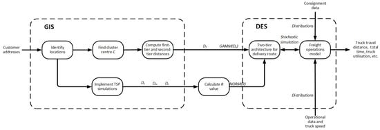 The simulation model was developed in Arena in accordance with the two-tier architecture: (a) first-tier movement, (b) second-tier movement, (c) and the return to the depot. The architecture of the DES model is shown in