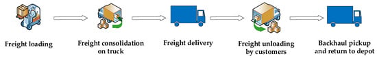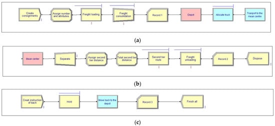Figure 12b, when the truck finished the first-tier movement, the truckload sequentially completed the second-tier movement with stochastic distances. The freight was assumed to be unloaded by customers. Last, after completing the transportation of all consignments, a return module was applied to the truck. As