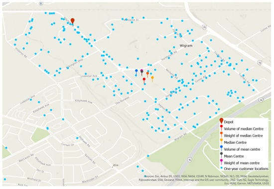 Mean centres, median centres with volume and weight attributes were calculated in ArcGIS, as shown in