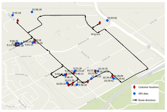 n = 10 was selected and the corresponding customer locations were input to ArcGIS. The TSP simulation was conducted and compared with real truck GPS data, see