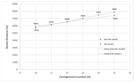 Stochastics simulations were conducted for each N case with 100 replications. All mean values of route distance are shown in