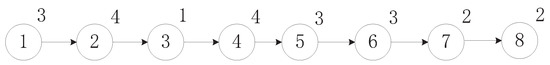 Consider the precedence relationship graph given in Figure 4 and the parameters are provided in Table 2. , . Tasks 1 and 2 are assigned to station 1 and update , . Then we should assign task 4 according to since and task 4 is not the last. We should take into account the cross-task design. By executing step 4, and , task 4 should be assigned to station 1 and station 1 shall borrow 1 unit of time from station 2. Update , , tasks 3 and 5 are assigned to station 2, and update , . Task 6 is assigned to station 3 due to , and station 2 lends 1 unit of time to station 3. Task 7 is assigned to station 3 and we update , . When assigning task 8, we find and task 8 is the last, and thus task 8 is assigned to station 4 directly. Finally, a feasible solution can be found, where , , and .