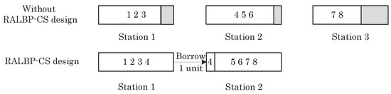 Task assignment is shown in Figure 3. The shaded part represents idle time. Without the RALBP-CS design, tasks 1, 2, and 3 are assigned to station 1; tasks 4, 5 and 6 are assigned to station 2; and tasks 7, and 8 are assigned to station 3. Thus, there are 3 stations installed, and some idle time is incurred on the line. If the RALBP-CS design is applied to the line, tasks 1, 2, 3, and 4 are assigned to station 1, which borrows 1 unit of the cycle time of station 2. Then, tasks 5, 6, 7, and 8 are assigned to station 2. The number of stations that are installed is two (one less than the line without considering RALBP-CS design), and there is no idle time at all on line.