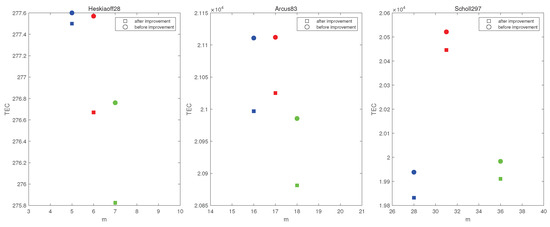 To test the effectiveness of the improvement mechanism, we compare the results before and after the introduction of the improvement mechanism. The sub-problems are derived from the datasets described in Section 5.1. The results of the comparison are shown in Figure 5. In Figure 5, the same color represents the same cycle time in datasets (Arcus, Heskiaoff, Scholl). Obviously, after the introduction of the improvement mechanism, although m has not changed, has become smaller for datasets of different sizes. Thus, the improvement mechanism we propose is effective.
