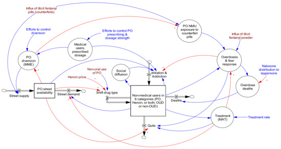 Opioid Epidemic Model diagram showing high level stocks, flows, and primary feedback structures. Red lines are causal links with negative valence, while blue lines have positive valence. Reproduced by permission from Homer and Wakeland 2020 [2].