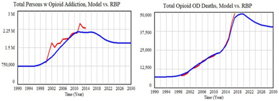 Figure 7 shows the trajectories for two example outcomes calculated by the model using the optimized parameter set compared with the available historical data for these metrics. The MAEMs for the two outcomes in Figure 7 were 9% and 4%. The calculated Persons with Addiction trajectory was somewhat biased downward, whereas the OD Deaths trajectory matched very well. One possible reason could be the amount of data available: the standardized errors for the first variable may carry somewhat less weight than the second one. Additionally, note that measurement uncertainty was greater for the first variable than the second one.