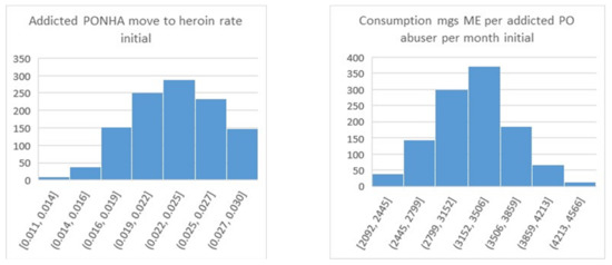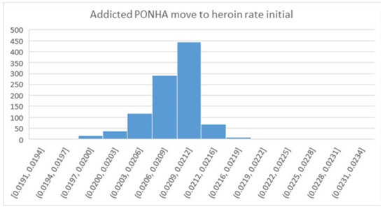 We next examined the properties of the parameter samples contained in the N-QPS. The rows at the bottom of Table 2 show the minimum, maximum, mean, and standard deviation of each parameter. For more detail, histogram plots were created, with examples shown in Figure 8. The parameter shown on the left, Addicted PONHA move to heroin rate initial, was limited to be in the 0.01 to 0.03 range. As the histogram shows, nearly all of this allowed range was included in the N-QPS. The mode was about 0.0235, which was slightly higher than its value of 0.021 in the optimized parameter set. The parameter on the right, Consumption mgs ME per addicted PO abuser per month initial, was limited to be in the range of 2000 to 5000; the values in the N-QPS were well inside these limits (2092 to 4566). The mode was 3330, very slightly higher than its value of 3200 in the optimized parameter set. One can examine all of the parameter histograms in this fashion to build confidence in the sample.