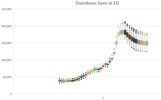 Excel box-and-whisker time series plot for Overdoses Seen at ED under the baseline scenario.
