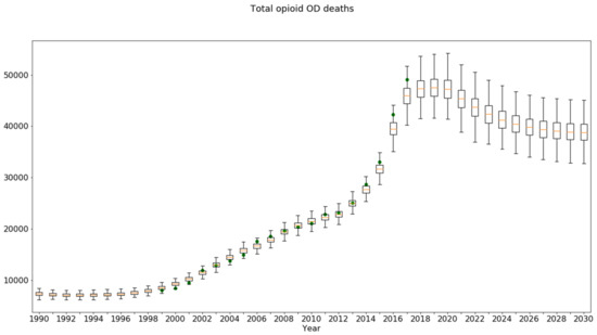 Python box-and-whisker time series plot for Total Opioid OD Deaths under the baseline scenario, overlaid with historical data (green dots).
