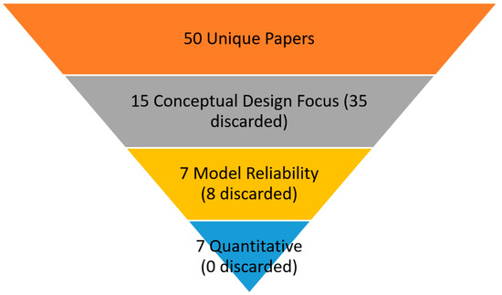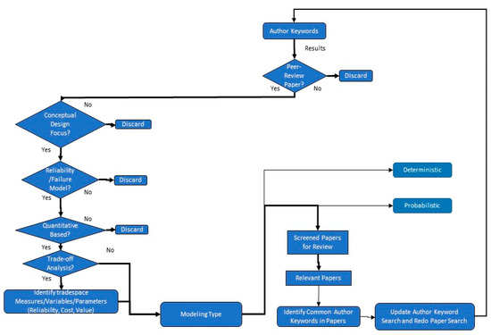 Our next step of the literature review process was to screen each paper for their relation to conceptual design, reliability, and quantitative modeling. This process is shown in Figure 2 with the number of papers maintained and discarded at each step.