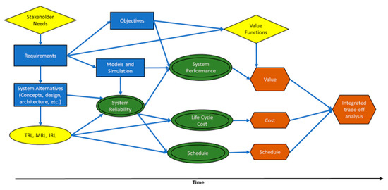 Figure 4 begins with stakeholder needs, under the assumption that those needs are known. Stakeholder needs inform decisions about system-level requirements. Decisions are made about the potential system alternatives to meet the requirements. The technology readiness levels (TRL), material readiness levels (MRL), and integration readiness levels (IRL) depend on the system alternatives. Requirements lead to decisions about objectives, system performance measures, and models and simulation. Models and simulations calculate the system reliability and system performance of the system alternatives. The system reliability and readiness levels are used to calculate the life cycle cost and the schedule of the system alternatives. Objectives and requirements inform value functions. The performance and value functions determine the value of the system alternatives using an additive multiple objective value model (Section 4.3). Integrated trade-off analysis is used to assess the value, cost, and schedule trade-offs of system alternatives.