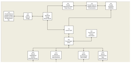 Table 3 is a list of UGV functions and their functional relationships. The term “functional relationship” refers to functional dependencies, but due to the circular relationship of the functions, dependency is not the term used. For example, Function 8.0 depends on either function 9.0, 10.0, 11.0, 12.0 or 13.0. However, all those functions could depend on function 8.0. The interesting factor here is that we look at these functions as relationships instead of acyclic dependencies. These functions are ways of showing the flow of information. A visualization of the functions is shown in Figure 6.