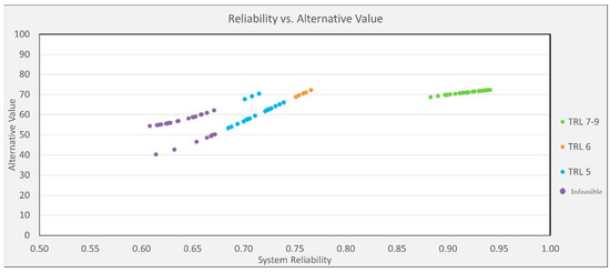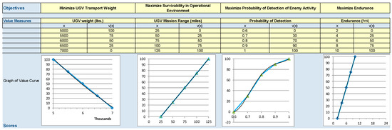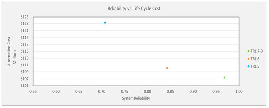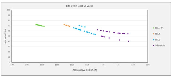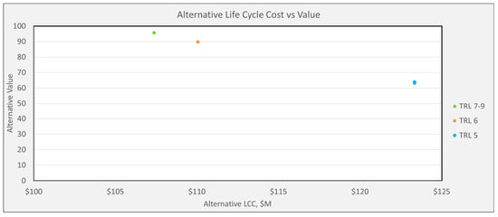 An important element of the tradespace is the value of a design alternative. Multiple objective decision analysis (MODA) quantitatively assesses the trade-offs between conflicting objectives by evaluating an alternative’s contribution to the performance measures and the importance of each performance measure [59]. The MODA model is used to assess the alternative’s value using the objectives and performance measures (Table 7). The overall MODA value is shown vs. life cycle cost to define a value vs. cost tradespace.