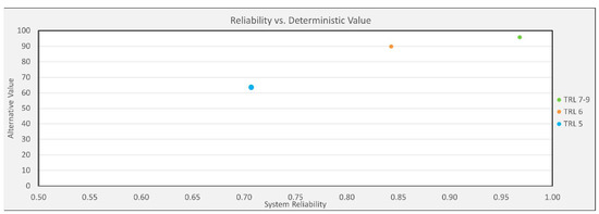 As mentioned before, reliability data in conceptual design can be hard to obtain. Therefore, this functional analysis approach is adapted to work with technology readiness levels to indicate the potential reliability of a high-level function. This approach allows analysis of the relationships between functions and how they impact performance, value, and cost in our Excel model implementation. The Excel index function is used for three readiness levels (low, median, and high) assumed for a given system component. The system reliability is then calculated based on the system’s functional structure using Equations (1) and (2). If a function depends on all functional relationships, it is indicated by AND logic. If it only depends on a minimum of one function, it is indicated by OR logic in the functional relationships table. The following equation is used to turn the logic into a reliability estimate based on the functional relationships. To indicate the best-case scenario of non-failure, the framework takes the maximum reliability value of the functional relationships.