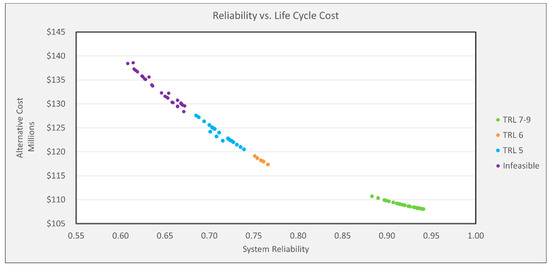 We believe that this research provides an illustrative example for a notional UGV system that demonstrates that reliability can be incorporated in early life cycle trade-off analyses and has the potential to provide important insights about the tradespace that could be missed in early concept design. This research generated a tradespace by enumerating all combinations of design decisions using functional TRLs and the SIPmath tool. The analysis is promising for continued work on reliability modeling methods early in the system life cycle.