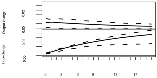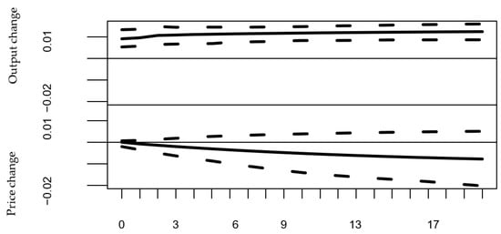 It can be seen in Figure 3 that, under one positive standard deviation of the permanent shock, the output rises and price levels fall. It can be seen in Figure 4 that, under one positive standard deviation of the temporary shock, the output rises at the beginning but, over time, the resulting change falls to zero and the price level rises. Figure 3 and Figure 4 conform to the assumptions of Blanchard and Quah [27].