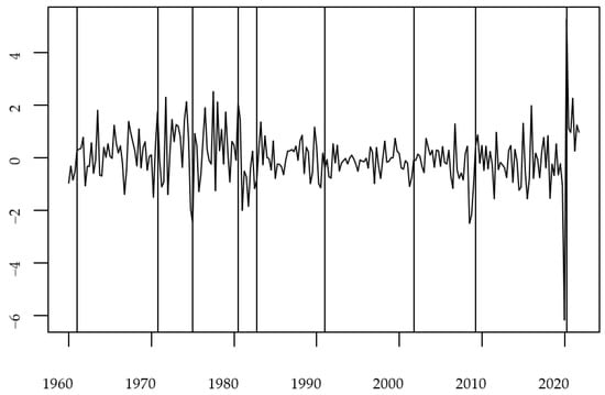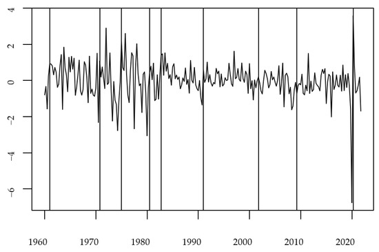 | 15 | The vertical lines in Figure 5 and Figure 6 represent the trough dates of the NBER business cycle turning points (http://www.nber.org/cycles/cyclesmain.html) (accessed on 11 September 2022). They include May 1954 (II), April 1958 (II), February 1961 (I), November 1970 (IV), March 1975 (I), July 1980 (III), November 1982 (IV), March 1991 (I), November 2001 (IV), June 2009 (II), and April 2020 (II). |