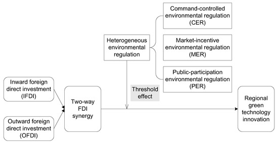 Based on the above factors, we aim to expand on the following aspects. (i) We choose two-way FDI synergy as the research topic and use the capacity-coupled-system model to measure it. (ii) We introduce environmental regulation as the threshold variable and empirically study the threshold mechanism of two-way FDI synergy on regional green technology innovation. (iii) Based on the perspective of heterogeneous regional environmental regulation, we divide heterogeneous environmental regulation into CER, MER, and PER. Then, we compare and analyze the threshold differentiation effect of two-way FDI synergy on regional green technology innovation under different environmental regulation tools. This study addresses the specific gap in two-way FDI synergy-driven green technology innovation. Our findings contribute to clarifying the mechanism of two-way FDI synergy, promoting regional green technology innovation, and formulating rational and effective heterogeneous environmental regulation policies. The research framework is illustrated in Figure 1.