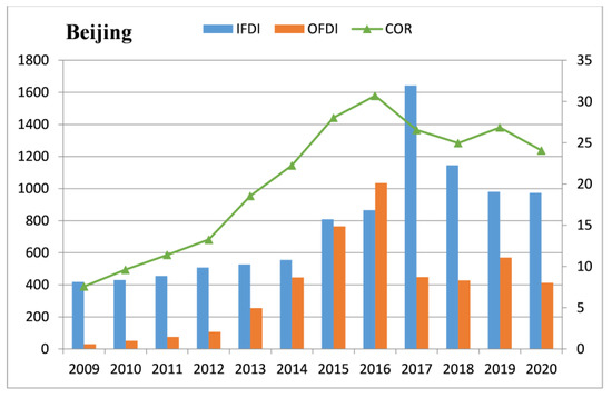 To intuitively show how the index of coordinated development depends on the two directional FDI measures, this paper takes Beijing as an example and draws a relationship diagram of IFDI, OFDI and COR in Beijing from 2009 to 2020, as shown in Figure 2.