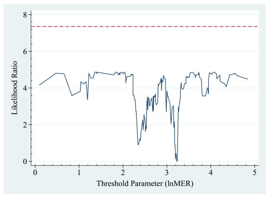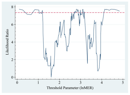 Figure 3 and Figure 4 show that when the LR value is 0, the corresponding two threshold parameters are 7.182 and 8.974, which are the estimated threshold values. When all the LR values are less than 7.35 (the red dotted line is 7.35 in the figure), the confidence intervals of the two threshold estimates are [6.829, 7.482] and [8.407, 9.190], both of which are within the corresponding confidence intervals. The double-threshold estimates pass the authenticity test. Consequently, we choose the double-threshold model for empirical analysis.