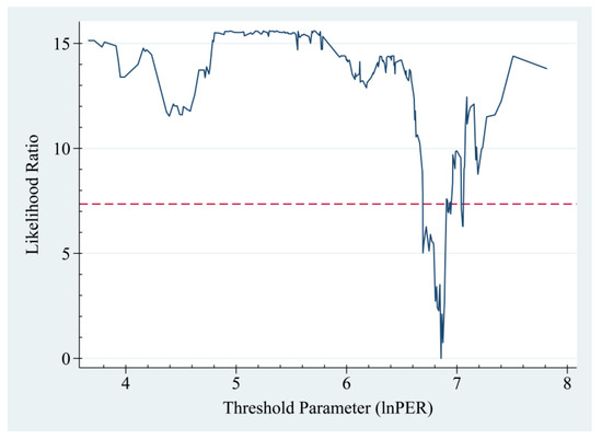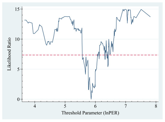The estimation process of the Hansen threshold-panel-regression model is as follows. First, the threshold estimate is determined. Given the candidate threshold value , the least squares method is used to estimate each parameter and the corresponding residual sum of squares . The estimate of the threshold value , , can be obtained from the least residual sum of squares . Second, we test the significance and authenticity of the threshold estimate. Since the F-statistic constructed in the Hansen threshold-panel-regression model is nonstandard, the corresponding critical value cannot be obtained from the table. As a result, the bootstrap method is used to obtain the p-value for the significance test. For a single threshold, the original assumption is ; that is, the estimated threshold value is equal to the true value. The authenticity of the threshold is tested by constructing the likelihood ratio statistic . When ( is the significance level; under a 95% confidence interval, ), the original hypothesis is accepted. The principles of the double threshold test and multiple threshold test are similar. Third, the threshold interval and confidence interval of the threshold estimate are determined.
