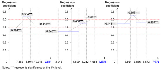 To further explore the influence mechanism between the variables and fully explore the threshold differentiation effects of two-way FDI synergy on regional green technology innovation under heterogeneous environmental regulations (CER, MER, and PER), we construct Figure 9 based on the threshold-regression results of Table 5, Table 8 and Table 11.