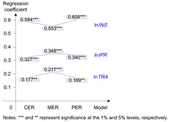 Table 2 shows the following. First, two-way FDI synergy always has a significant promoting effect on regional green technology innovation, indicating that simply increasing it can effectively promote improved regional green technology innovation. As a high-quality innovation achievement, regional green technology innovation has great demand for knowledge resources. Two-way FDI synergy can bring advanced technology, cutting-edge knowledge and high-end talent to somewhat compensate for the lack of high-quality development of regional green technology innovation. Second, models (2), (4), and (6) show that the regression coefficients of lnCOR×lnCER, lnCOR×lnMER, and lnCOR×lnPER are 0.028 **, 0.030 **, and 0.020, respectively, which are all positive, indicating that the three types of heterogeneous environmental regulation can enhance the promotion of two-way FDI synergy on regional green technology innovation. Third, models (3), (5), and (7) show that CER, MER, and PER have no significant effect on regional green technology innovation, as a result of which the interactions of the three types of heterogeneous environmental regulation and two-way FDI synergy fail the significance test. This indicates that simply increasing the three types of environmental regulation does not promote regional green technology innovation. Consequently, it is obviously flawed to take heterogeneous environmental regulation as a general independent variable to estimate the model. Fourth, regarding the control variables, IPR, INS, and TRA all have significant positive effects on regional green technology innovation. A more in-depth analysis of the relationships between these control variables and regional green technology innovation will be presented in the subsequent part of this paper.