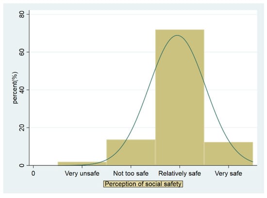 Perception of Social Safety. The independent variable is the perception of social safety. Social safety perception is defined as the subjective affective or emotional reactions of the public in the process of assessing social risk and social vulnerability [19]. Regarding the measurement, scholars have mainly used questionnaire surveys to obtain citizens’ subjective feelings and psychological evaluations of social safety conditions [48,49]. Similarly, the perception of social safety in the 2017 CSS survey is measured by asking respondents the following question, how do you feel about the current social safety situation in society in general? The respondents have five options including very unsafe, not too safe, relatively safe, very safe, and hard to say. However, very few people (N = 64) answered hard to say, and, thus, we removed them. Figure 1 describes the distribution of citizens’ perception of social safety, and most of the participants showed a relatively safe feeling. The average social safety perception of participants surveyed is 2.949, close to relatively safe.