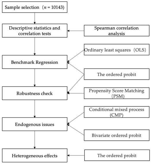 In Equation (8), refers to the treatment variables including 1 and 0. When = 1, the individual enters the treatment group; when = 0, the individual enters the control group. In this study, the core independent variables are divided into two categories, namely, the treatment group of citizens who use the Internet and the control group of citizens who do not use the Internet. represent the estimated results for the treatment and control groups, respectively. Equation (9) represents the Average Treatment Effect on Treated (ATT) for the treatment group. All data processing and analysis were performed using STATA16. Figure 2 shows the technical research framework adopted.