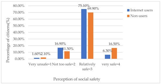 In total, this study included 4069 Internet users accounting for 40.12%, and 6074 non -Internet users with average perception of social safety amounted to 2.949. It shows that the total percentage of citizens who do not use the Internet choosing very unsafe and not very safe is 13.6%, which is lower than the 18.5% of citizens who use the Internet. The total percentage of citizens who do not use the Internet choosing relatively safe and very safe is 86.4%, which is significantly higher than that of citizens who use the Internet (81.5%). Figure 3 provides the details. In addition, the average social safety perception of Internet users is 2.86, while the average social safety perception of non-Internet users is 3.01. This means that the social safety perception of citizens who do not use the Internet is slightly higher than that of Internet users.