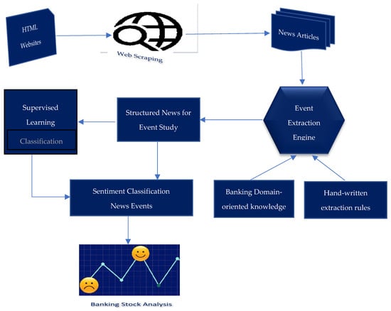 Important financial news is increasingly available in electronic form on the WWW, and it has evolved to be a very useful data source for event studies [17] incorporating stock market evaluations [18]. By following up on a variety of online news sources and building a news classification system, investors in the Indian stock market’s banking sector can be notified of potential financial banking events. To our knowledge, there is presently no news classification system created exclusively for the banking sector. Therefore, online financial news is classified as: banking, other related news articles of interest, and non-banking. Further, the news articles on ‘events’ of our interest—mergers and acquisitions, frauds, expert ratings, earnings results, government policies, and RBI policies—are extracted from banking news and other news articles using our classification system. Finally, the tone with which news events of the banking sector are broadcast is correlated to observable stock price volatility. Therefore, we intend to classify the above-mentioned six banking news events into positive and negative sentiments and assess their influence on the stock prices of the private and public banks involved.