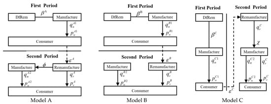 These three models only have M performing DfRem in the first period while maintaining the same product design in the second. During the second period, R must pay patent licensing fees to M before remanufacturing and selling in Model A. For example, businesses such as Sany Heavy Industry Co., Ltd. (Beijing, China) and The Peterbilt Company (Washington, DC, USA) permit remanufacturing enterprises to conduct recycling and remanufacturing through patent authorization []. In Model B, R is free to engage in remanufacturing and sales activities without paying M any royalties for the use of its patents (for instance, ink firm Repeat-O-Type (Wayne, NJ, USA) reproduces Hewlett-Packard Company (Palo Alto, CA, USA) ink cartridges []). In Model C, R resells all the remanufactured goods to M, who then evenly sells both new and remanufactured goods. M controls the resale price of the remanufactured goods in this scenario.