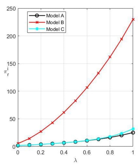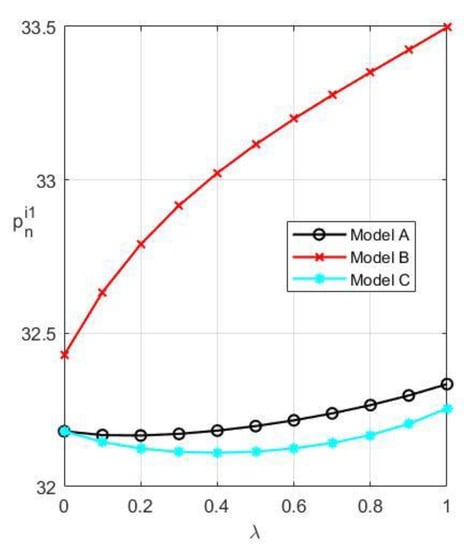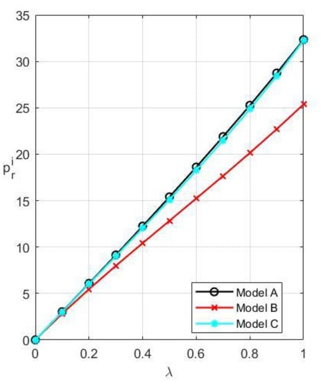 In the third stage, solve the optimization problem of R’s profit. can be obtained by taking the second derivative of Equation (3) with respect to , so is a concave function with respect to , and Equation (3) has an optimal solution. According to the first-order condition of Equation (3), the reaction function of can be solved as