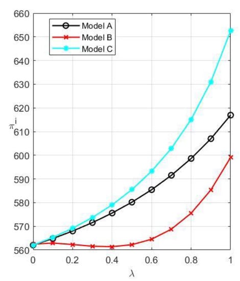 The overall profit of M is the largest in Model C and the lowest in Model B, as shown in Figure 8. Additionally, M’s total profit steadily rises in Models C and A, while it gradually declines in Model B as customer willingness grows. The overall profit of R is the largest in Model B and the lowest in Model A, as shown in Figure 9. In addition, M’s profit grows steadily in all three models as consumer willingness rises. The above phenomenon demonstrates that M favors collaboration anytime it is possible, but R will only collaborate when M holds the patent rights. Therefore, M should grasp the patent rights while actively seeking collaboration rather than promoting patent protection to oppose R. R will not have the intention to work with M until M obtains the patent rights. The two parties should now collaborate to increase the market acceptance of remanufactured products. Conversely, both parties should try to increase consumers’ willingness to pay for their products if M is unable to get patent protection. As observed in Figure 10, collaboration is a better option to ensure the steady growth of CLSC. From the perspective of the profit of CLSC, the profit in Model C is the greatest and the lowest in Model B.