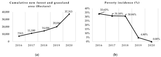 Reference modes of EPA in Lanping. (a) Cumulative new forest and grassland area in Lanping from 2016 to 2020; (b) Poverty incidence of Lanping from 2016 to 2020.