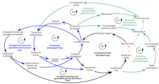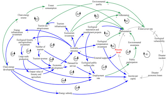 Tourism development represents a good approach to realizing poverty alleviation and economic growth by improving tourism receipts, generating increases in job creation, and raising incomes [49]. Meanwhile, pro-poor tourism can provide socio-cultural and even environmental benefits [50,51]. Ecotourism is another important strategic choice for poverty alleviation in Lanping. At the stage where ecotourism begins, the Lanping government has improved the preservation and restoration of ecological resources and enhances tourism infrastructure to attract tourists (R3, R4, and R5). The increase in tourism brought more revenue to the economy. This in turn provided more available resources for exploiting and utilizing tourism resources in Lanping. At the same time, the development of ecological industries not only expanded employment opportunities but also injected new vitality into the rural economy and raised income-generating capacity for poor rural households (B6 and B7). In addition, the ecological industries offered many tools for public participation and provide them with huge economic benefits, including employment opportunities, increased income, and business opportunities [52]. Therefore, residents can better perceive the value of the ecosystem and increase local environmental awareness, and reduce their behavior that damages the environment (R6).