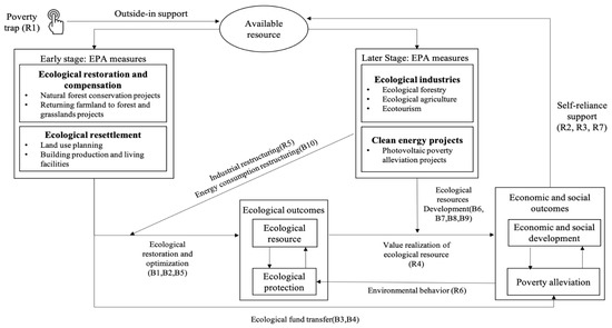 Ecological Poverty Alleviation (EPA) is a dynamic and evolving process, which involves a wide range of resource management strategies and practices, multiple sectors and various stakeholders, and comprises numerous feedback structures. This process of EPA is now very poorly understood and research in this area has been scant. Thus, we posit that understanding the EPA process will benefit significantly from applying CLDs in the identification and analysis of the key feedback structures in EPA. Our assertion is supported by similar research in the literature when analyzing complex systems. For example, Hjorth [30] found that common sense and holistic systems thinking are essential starting points for improvements in the quality of decision-making and the learning and innovation in poverty alleviation efforts.