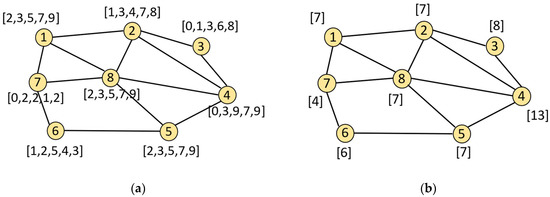 The traditional METIS algorithm is applied to some static graphs without dynamics. However, there are many graphs with dynamics in the real world, so we need a new method for partitioning with dynamics. We enabled the METIS algorithm to be suitable for a graph with dynamics by designing the dynamic process compression strategy of vertexes. First, we give a case of dynamic process compression on a graph, as shown in Figure 3; in Figure 3a, we give every vertex five states; and in Figure 3b, we sequentially compute the sum of dynamic changes for each vertex as the new weight for vertexes. For example, the vertex numbered 1 has five states: 2→3→5→7→9, and is then compressed into a weight = 7. This compression method will be mathematically detailed later.