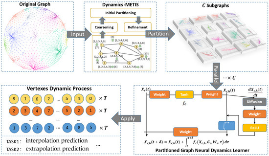 Fortunately, in the era of big data, many complex network systems have produced a large amount of available data in the process of dynamic development. When seeking a model for the data, we can learn its dynamics on a graph with a combination of ODEs and GNNs. In addition, after the complex system is abstracted into a graph, its complex network structure, large-scale edges and vertexes, and complex dynamics processes form a series of NP-complete problems [11,12]. This results in the poor performance of many models and algorithms on the graph. However, there is a better method, namely, graph partition. This process evenly divides the large-scale graph into a series of subgraphs to adapt to distributed applications. Therefore, the learning process of the dynamics on a graph can be accelerated by graph partition. Based on this, we proposed a model framework for graph partition to accelerate the graph neural dynamics learning process. This method skillfully combines the dynamic process on the graph with the fast graph-partition algorithm METIS and realizes a large-scale graph-partition method considering a dynamic process. After the large graph is divided evenly, the dynamics of each subgraph can further be learned in parallel by combining GNNs [13,14,15,16] and differential equations. This helps us to recognize, predict, and control a complex system more quickly and accurately.