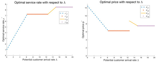 We know that when , the optimal service rate is , and the optimal price is . Using and to solve the first derivative of , we can obtain , . When , we know that the optimal service rate is , and the optimal price is . Using and to solve the first derivative of , we can obtain , . □