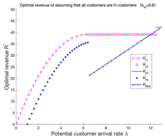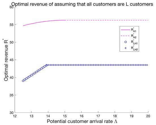 In or , the service provider’s belief that all customers in the system are L customers will not affect its revenue. However, Figure 3 illustrates that the service provider’s decision that ignores customer heterogeneity and considers all customers as L customers affects its revenue in or . Such a “wrong” decision makes the actual revenue lower than that when customer heterogeneity is taken into account in or .