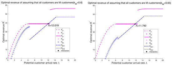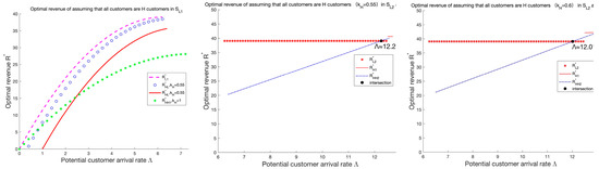 Since , , then , that is, the revenue in is greater than that in . This shows that with the increase in the potential customer arrival rate , only serving all H customers can obtain higher benefits than serving all H and L customers. Because of the increase in , only serving all H customers can not only alleviate the congestion of the system but also lead to H customers having higher perceived utility so that the service provider has more room to adjust decision making. Meanwhile, since , we can obtain , which indicates that ’s revenue is also greater than ’s.
