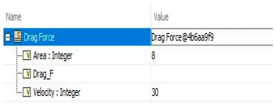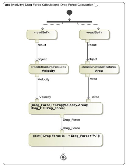 The activity diagram (see Figure 12) includes opaque action, which facilitates the executability of the model to calculate drag force. A separate MATLAB function was embedded inside the opaque action to make the diagram executable. The <<readStructuralFeature>>stereotype enables reading the inputs of area and velocity from the model. Users can change the values before running the simulation inside the cameo simulation toolkit (CST) (see Figure 13). The expected output for the simulation is the drag force which is indicated by the empty Drag_F value property.