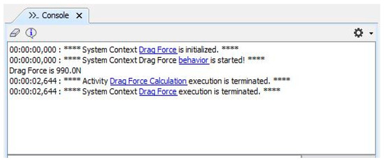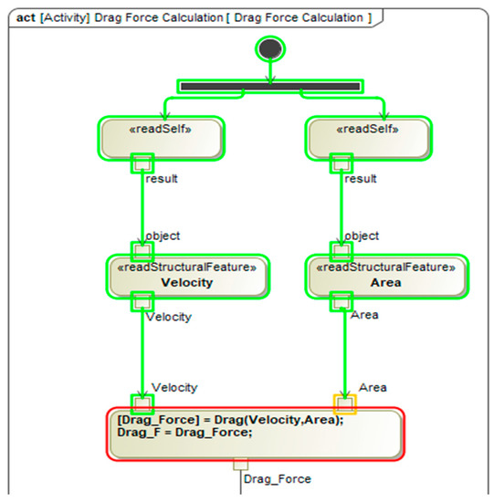While running the simulation, actions change colors based on their execution timing- green indicates executed before, yellow indicates immediately executed, and red indicates currently being executed (See Figure 14). After running the simulation, the opaque action forwards the inputs to the embedded MATLAB function in order to calculate the drag force. The function output is then returned to the SysML model and assigned to the “Drag_F” value property. Finally, the drag force is shown in the simulation console by printing the output Drag_F value property, as illustrated in Figure 15.
