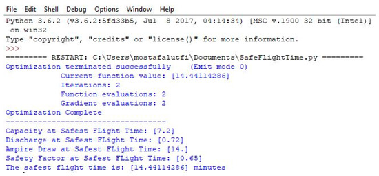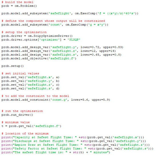 The optimization problem was formulated as follows: Safest Flight Time (min.) = ((Battery Capacity (Ah) × Discharge Rate) × 60 × Safety Factor)/Current Draw of UAV (Amps); constraints and design variables were defined within the script function. The initial values needed to run the OpenMDAO script were provided by CST by reading the initial values defined within the model using value property.