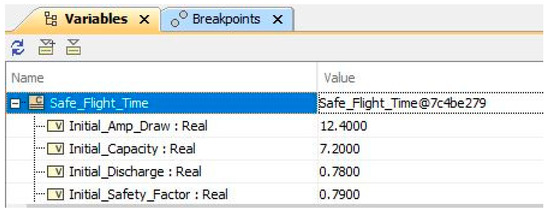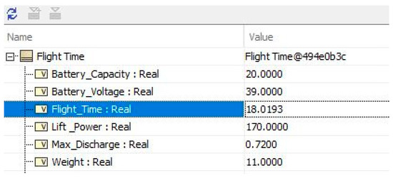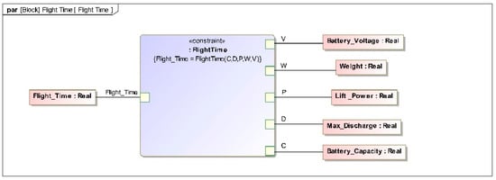 For simple SysML models, an activity diagram is a highly effective way of showing the mechanism of the calculations and enabling script integrations [39]. While executing complex system models, the use of the parametric diagram is a more proficient way of dealing with a high volume of data and calculations as compared activity diagram. Although the parametric diagram in CSM cannot incorporate all types of scripting languages supported by the activity diagram. However, it enables easy drag and drop capability of MATLAB scripts into the parametric diagram as a constraint block. So, we used the FlightTime MATLAB function to calculate the drone flight time, which takes the Battery_Voltage, Weight, Lift_Power, Maximum_Discharge, and Battery_Capacity as inputs (see Figure 21).
