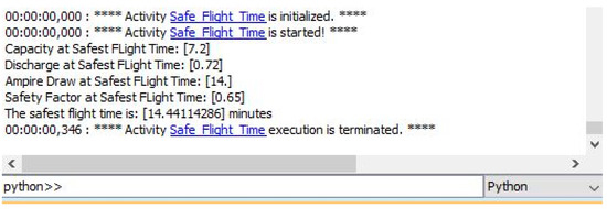 The location of the SafeFlightTime.py function script was provided in the body of the opaque action. The input to the Python script function were the values defined in Figure 17 in order to run the script. Activity diagram with opaque action and <<readStructuralFeature>>stereotyped action items were created to represent the integration mechanism with OpenMDAO-enabled Python scripting environment (see Figure 18). The output generated by the above script was visible in the CST console (Figure 19) to obtain the Safest Flight Time value (as calculated by the OpenMDAO tool).